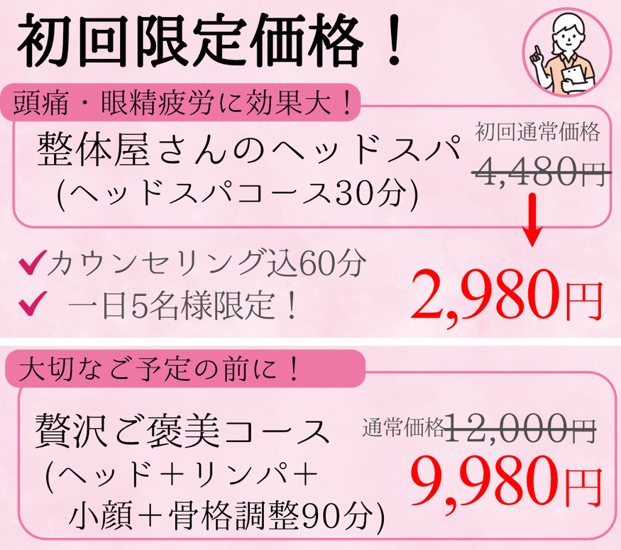 当院独自の「整体屋さんのヘッドスパ」に、全身のリンパマッサージもついたプランです!