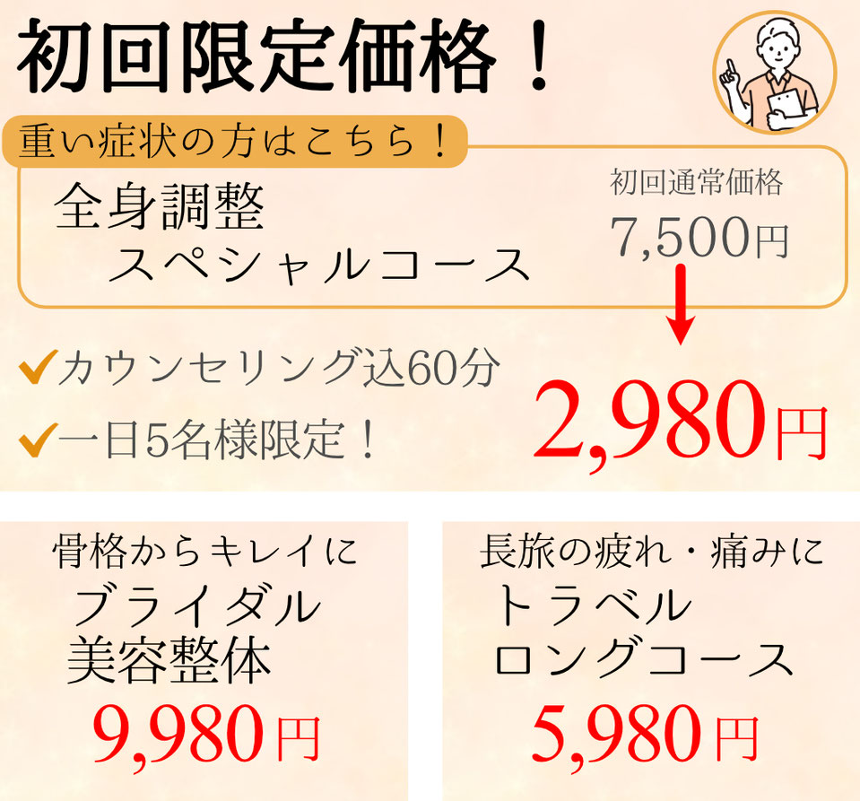 まず初回でお体の状態を見せていただき、今のあなたに最も適したコースをご案内させていただきます。